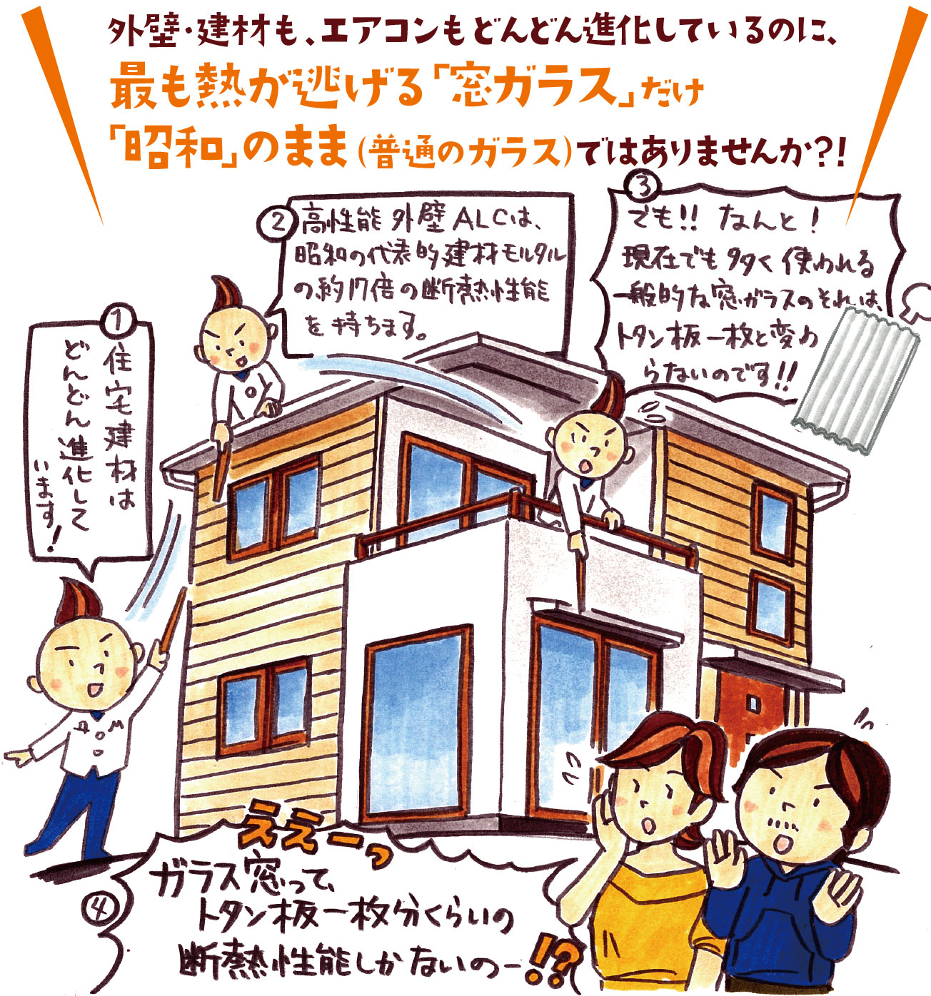 今の住宅建材はどんどん進化しています。普通と思って使っているシングルガラス一枚をとっても、 それを最新のガラスに変えるだけで断熱効果はグンとアップします。