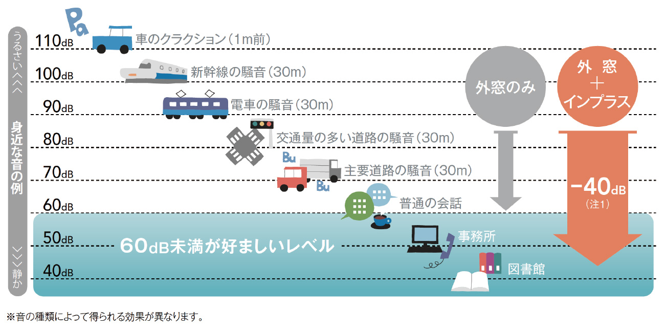外窓とインプラス、その間の窓間の空気層が障壁となり、 高い防音効果を発揮します。外の交通騒音や赤ちゃんの大きな泣き声も 静かな空間へと軽減します。不快感のない静かな住環境を手助けします。